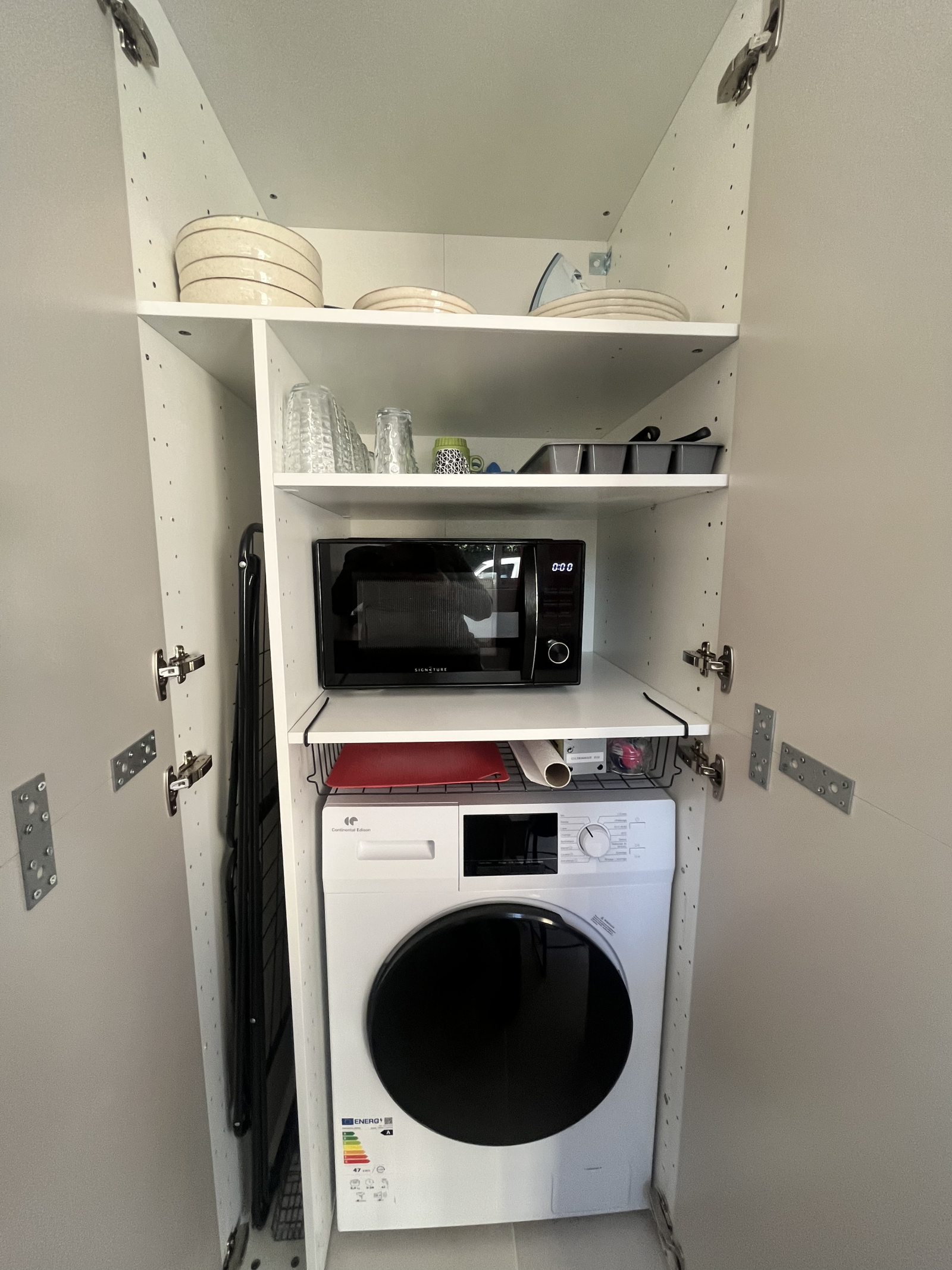 -d'une pièce de vie avec coin canapé tv et d'un coin repas avec cuisine équipée et aménagée (réfrigérateur, plaque de cuisson, hotte, micro ondes, lave vaiselle, lave linge, ...)