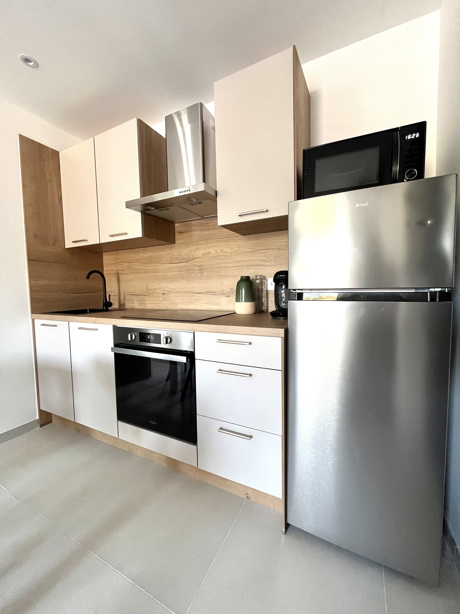 - d'une cuisine entièrement équipée et aménagée (réfrigérateur/congélateur, micro-ondes, four, plaque de cuisson, hotte, lave vaisselle, lave linge),
