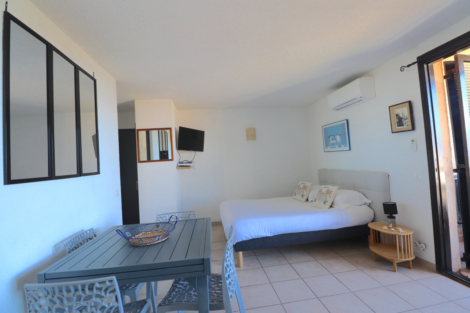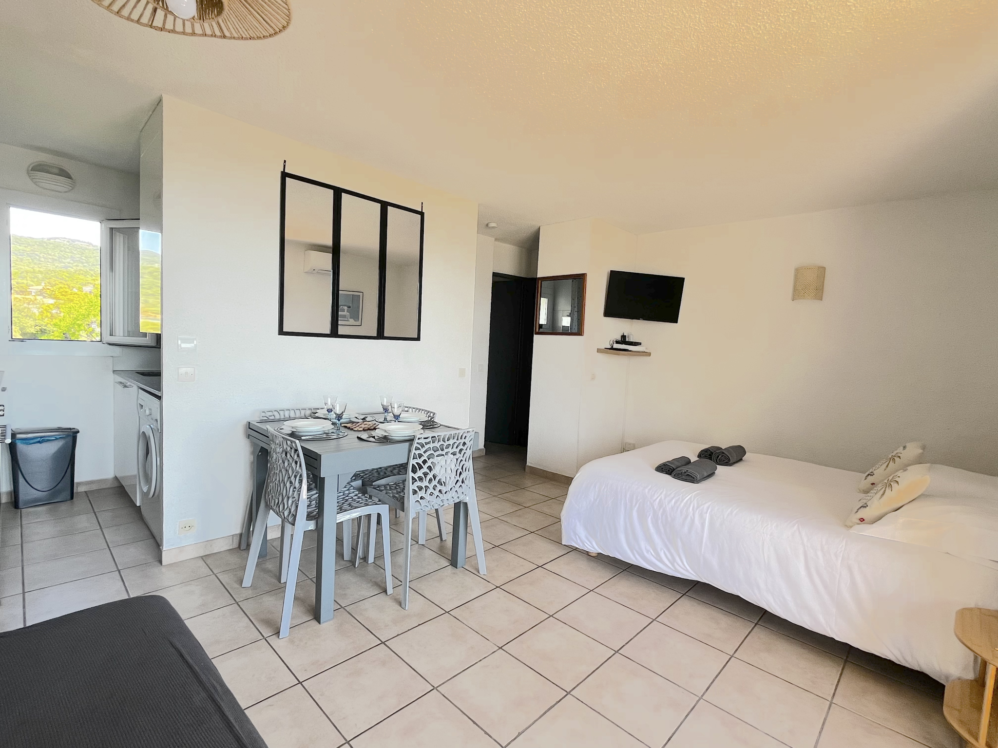 - une pièce de vie principale délimitée par un coin canapé lit et table à manger et d'un coin nuit avec un lit neuf en 140cm,