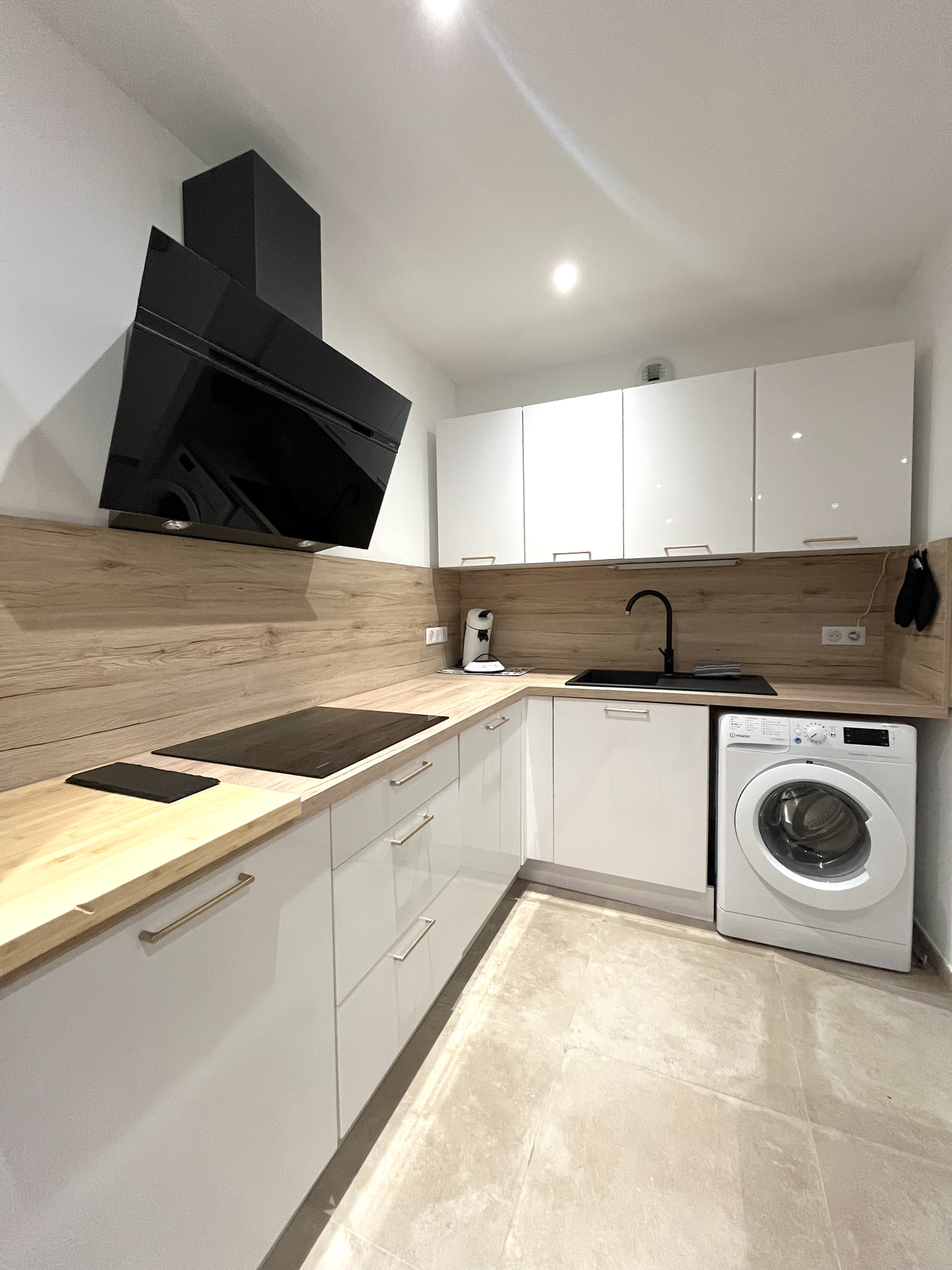 - d'une cuisine ouverte et entièrement équipée (lave vaisselle, four, plaque, cafetière, lave linge, réfrigérateur ...)